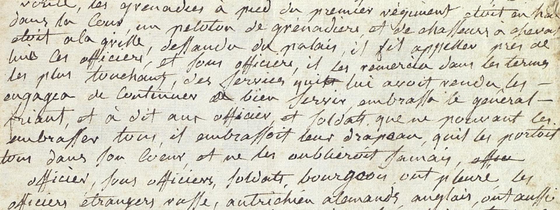 "Soldiers of my Old Guard, I bid you farewell. For twenty years you have been my constant companions on the road to honour and glory. In these latter times, as in the days of our prosperity, you have never ceased to be models of courage and fidelity. With men such as you our cause would not have been lost. But the war would have been interminable; it would have been a civil war, and that would have entailed deeper misfortunes on France. I have therefore sacrificed all of our interests to those of the country; I shall depart. But you, my friends, continue to serve France. Her happiness was my only thought; it shall continue to be the object of my desires! […]"